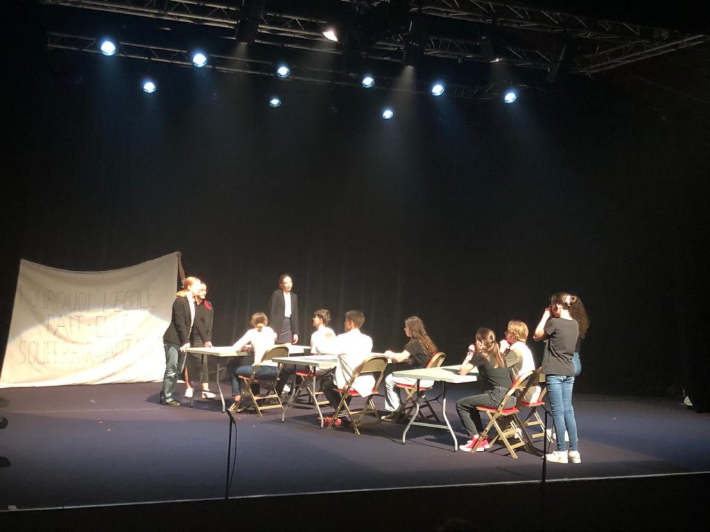 Le lundi 27 mai dernier, l’option théâtre a eu le très grand plaisir de retrouver l’atelier du collège Kennedy d’Allonnes à l’occasion du Printemps théâtral organisé par l’association Théâtre Pour l’Avenir. En effet, à la salle Jean Carmet d’Allonnes, nos jeunes ont eu le privilège de pouvoir représenter leur pièce dans des conditions rares puisqu’ils disposaient de deux régisseurs qui les accompagnaient en lumière et en musique.