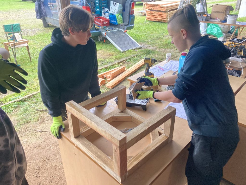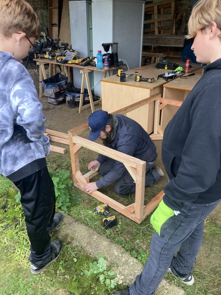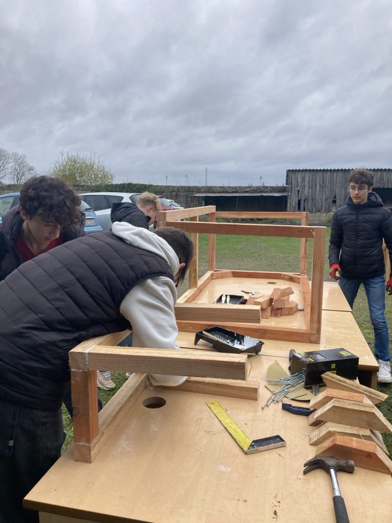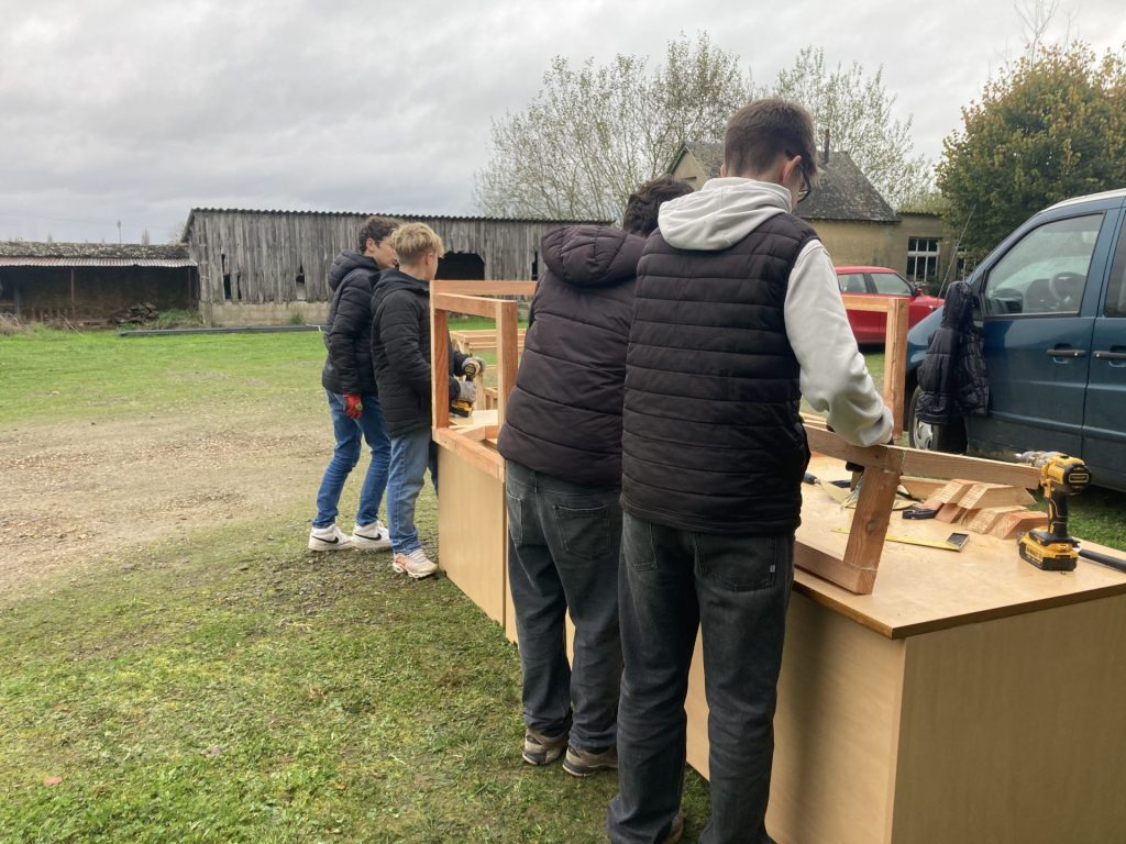 Dernière phase de notre chantier pour la construction de notre classe extérieure, 4 jours de travail de groupe en Novembre 2024, encadré par un artiste : Lucas Grandin, des enseignantes d’arts plastiques, mathématiques, Sciences de la Vie et de la Terre et un éducateur de vie scolaire. 35 élèves de 4e et 3e dont 14 élèves de l’Option Métiers, et 19 élèves du Parcours renforcé arts plastiques. Une classe extérieure utilisable dès le printemps 2025 quand la douceur sera revenue…
