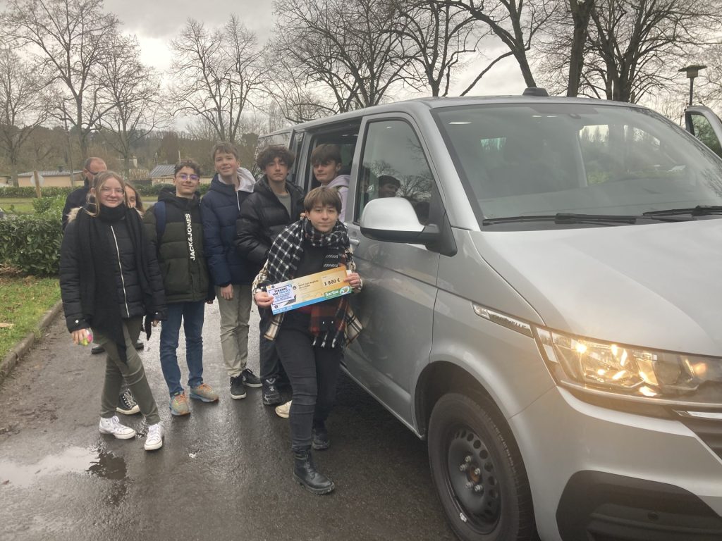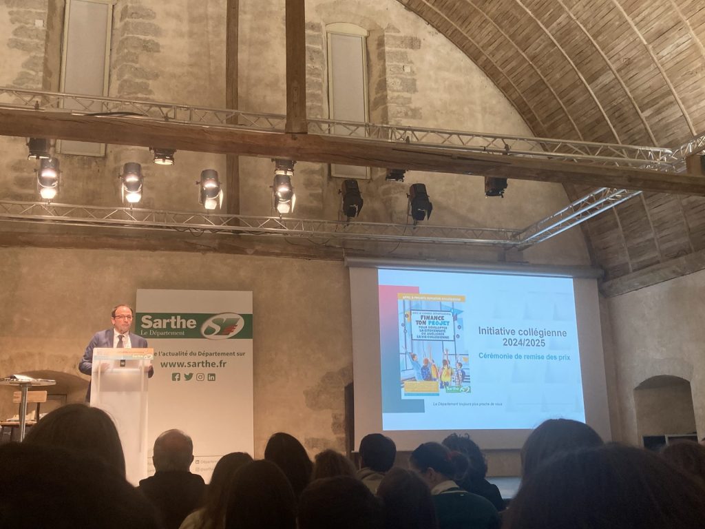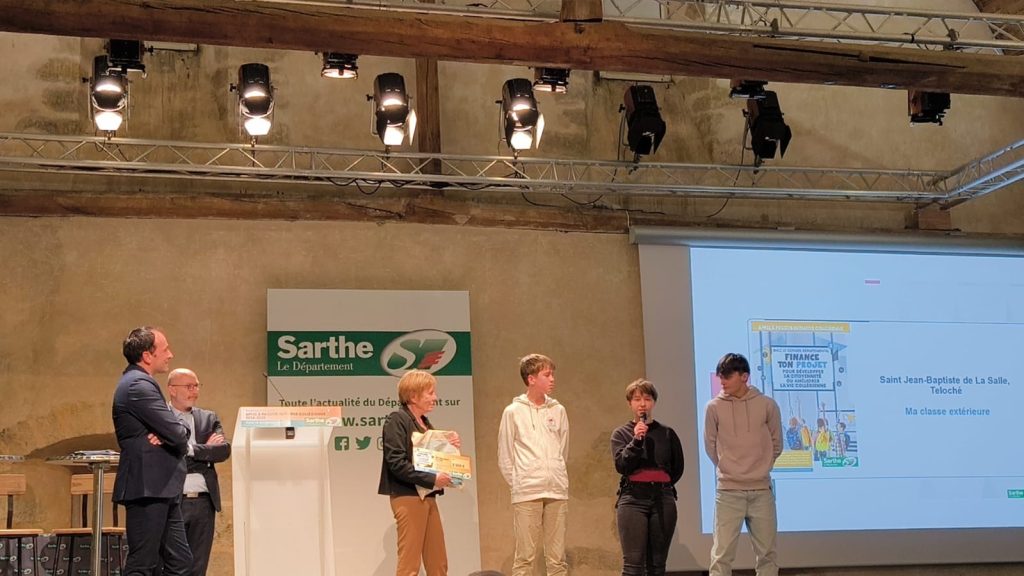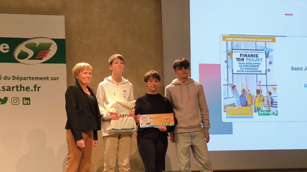 Sur scène, nos ambassadeurs : Coline, Paul et Tim, élèves de 3° … Bravo à eux !!! Et encore merci au Conseil Départemental pour leur soutien.