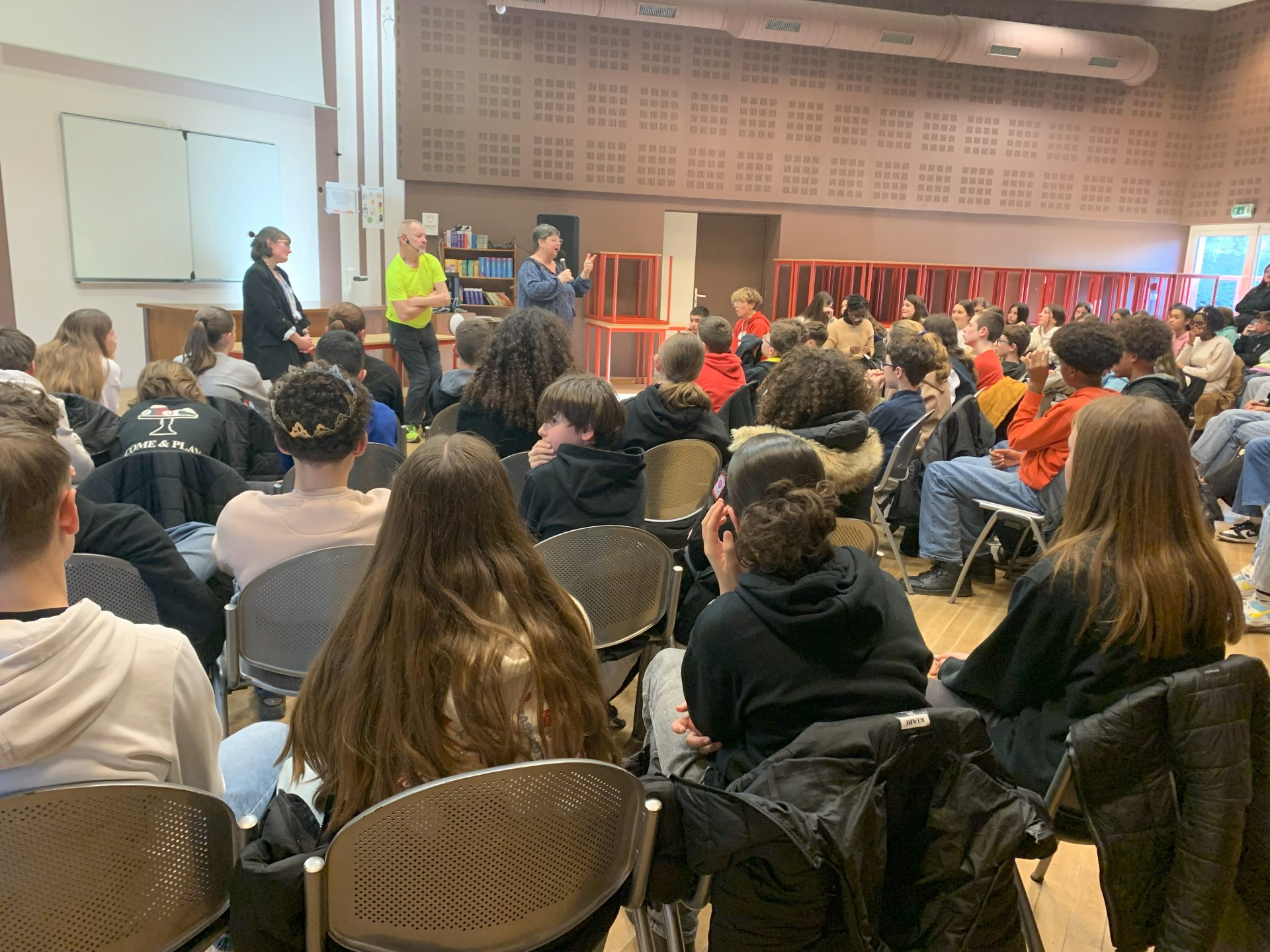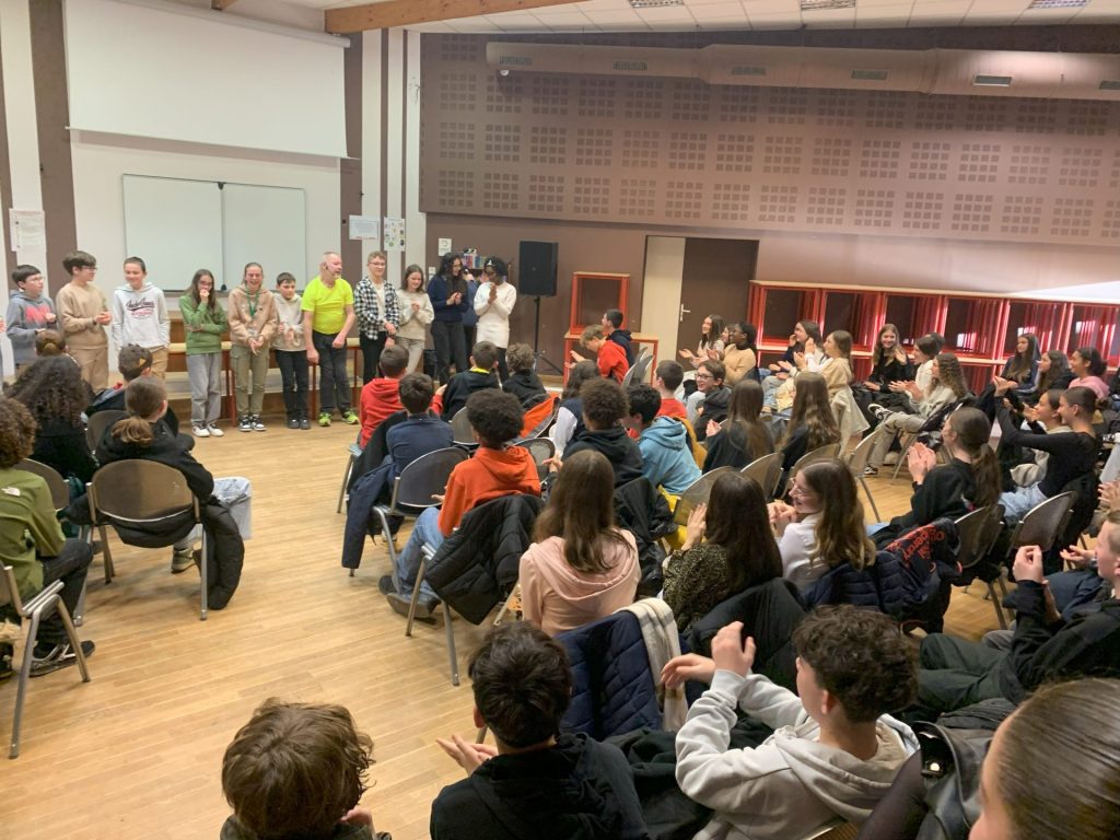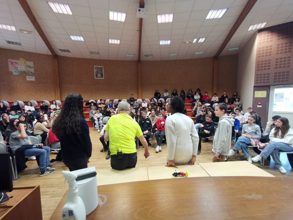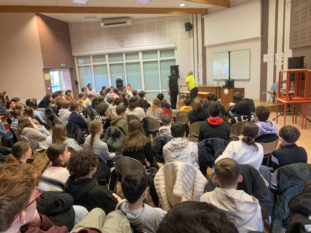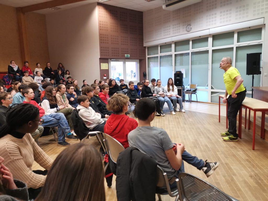 Les élèves de 4eme ont été sensibilisés au handicap et aux différences. Le jeudi 9 janvier 2025, ils ont rencontré Gilles Le Druillennec, fondateur de l’association Barrez la Différence (centre de voile adapté au handicap) et son épouse Agnès. Gilles, handicapé moteur suite à un accident de naissance a raconté son parcours de vie avec beaucoup d’humour. Plusieurs élèves et adultes ont pris une part active au spectacle en se mettant dans la peau de personnes qui ont marqué la vie de Gilles.