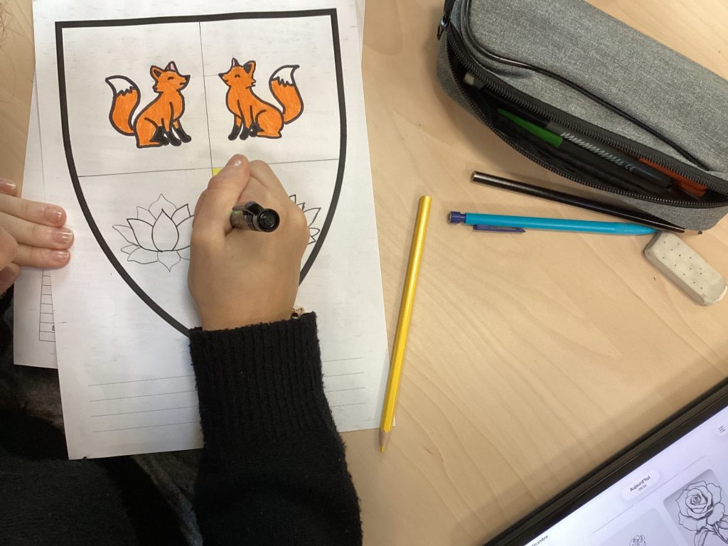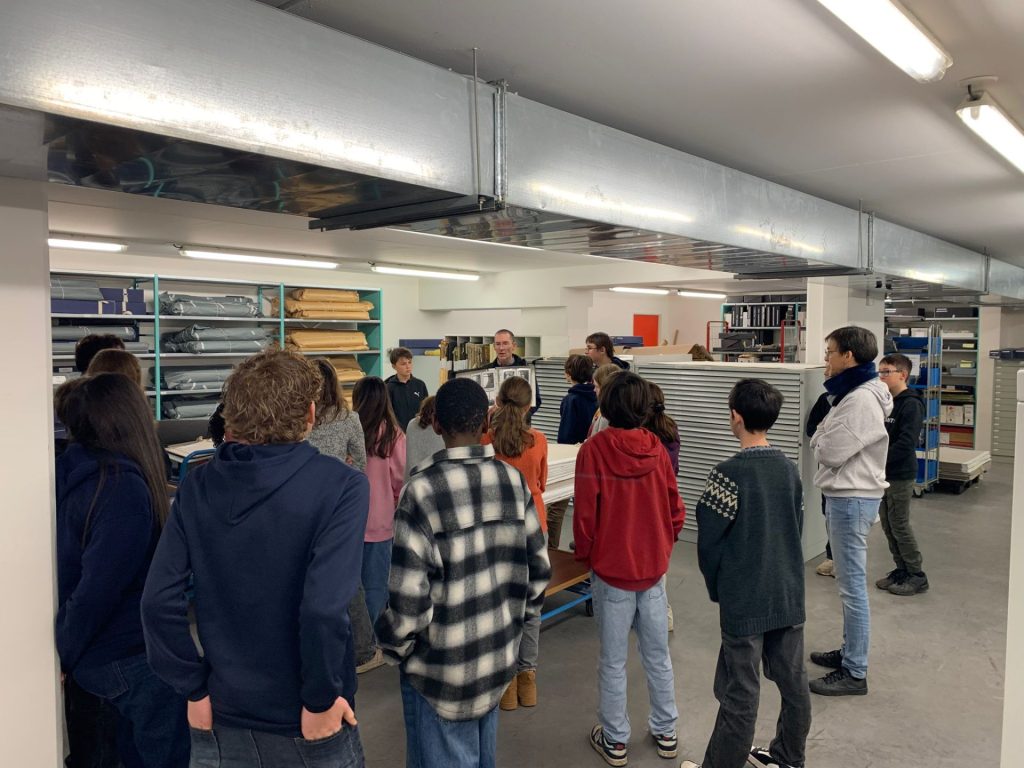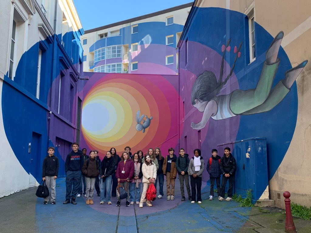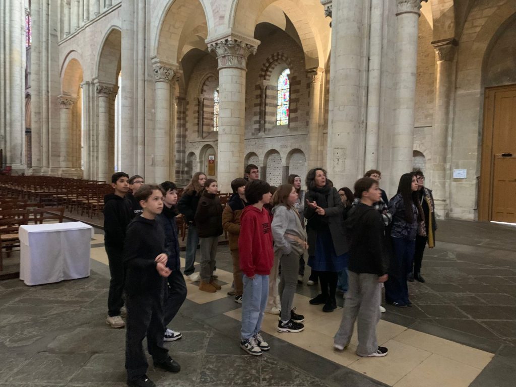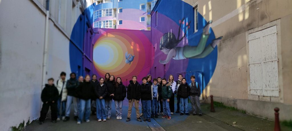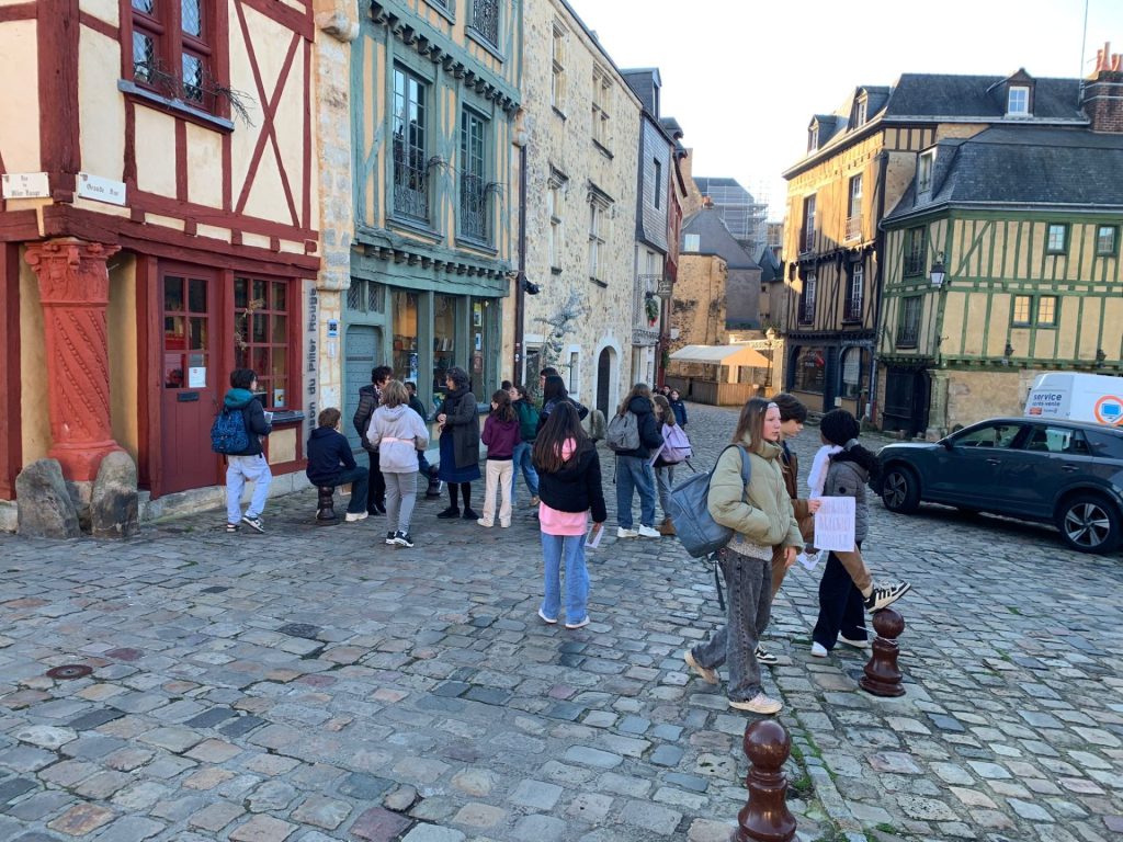 Les élèves de 5e au collège cette semaine ont pu profiter d’une semaine thématique sur le Moyen âge, commençant lundi par une journée au mans, afin de découvrir la cité Plantagenêt en piétonnant dans les rues pavées; la cathédrale Saint-Julien, son vitrail de l’Ascension et sa chapelle de la Vierge et ses Anges Musiciens. L’autre demi-journée s’est déroulée aux archives départementales de la Sarthe : découverte de ce lieu de conservation et travail sur le censier de l’abbaye de la Couture au Mans. Entre l’arrêt de tramway et la cathédrale, chacun des groupa a posé la fresque de l’artiste Seth « Rabbit Hole ». Les jours suivants, nos élèves ont pu à travers différentes disciplines expérimenter des techniques et savoirs- faire inspirés de l’époque médiévale : fabrication de blasons, de jeux d’époque, de peintures à base de pigments naturels, ainsi qu’assister à une prestation de « Marotte et les Musards » qui s’est déroulée en deux temps : Un spectacle d’1h15 basé sur la vie d’Adam de la Halle mêlant chants, jonglage, clown, instruments anciens, fabliaux, farces… suivi d’un échange avec les élèves. Enfin un repas médiéval s’est tenu au self le jeudi midi.