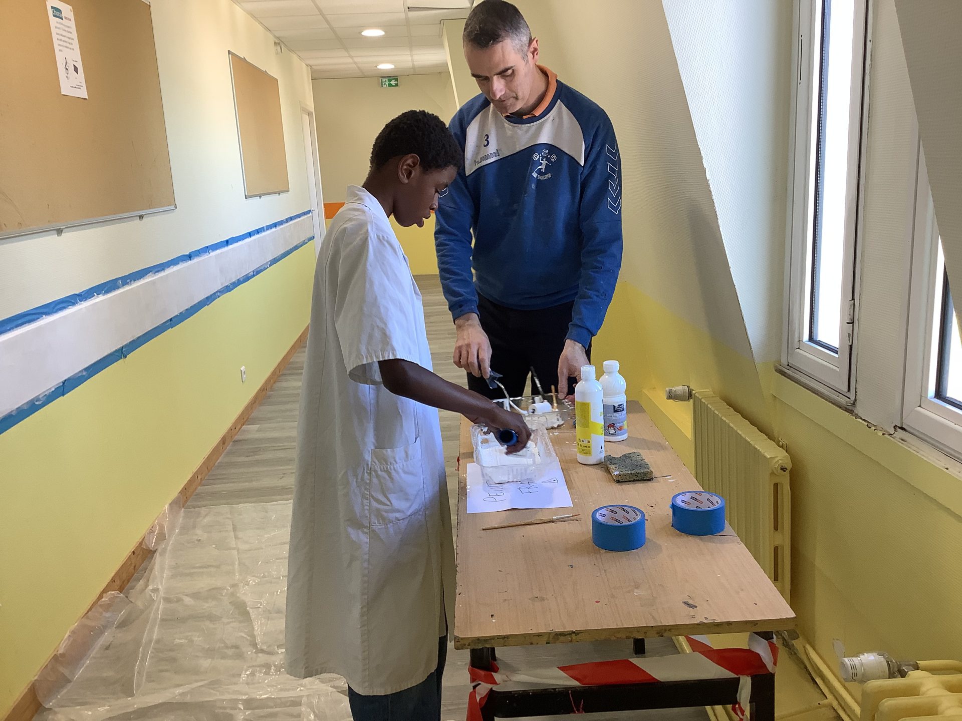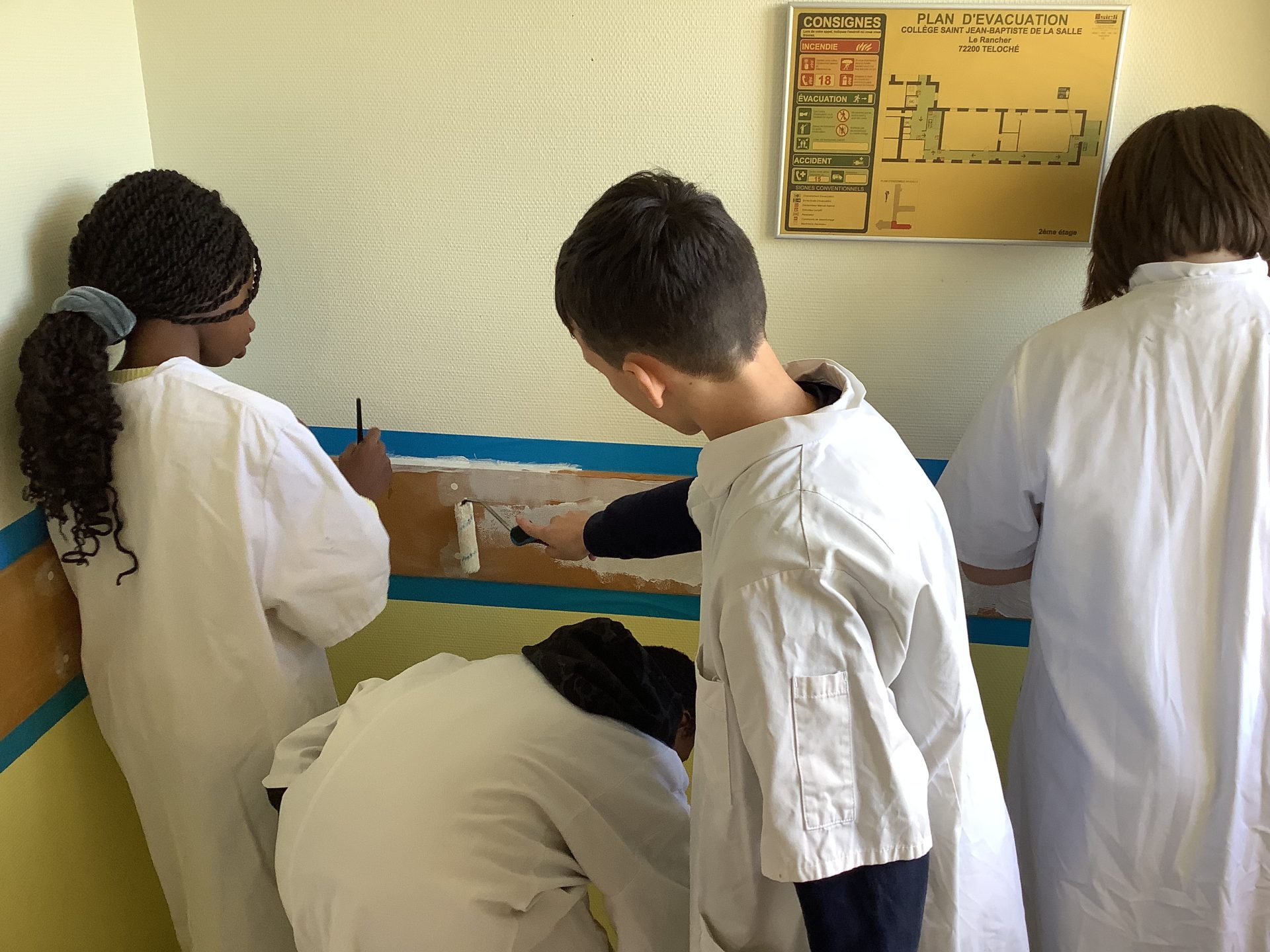 Les élèves ont ensuite entamé une phase d’observation et de préparation. Les protections murales en bois brut, appelées « lisses », ont été poncées et uniformisées afin d’obtenir un support propre et régulier. Les murs ont également été protégés à l’aide de ruban de masquage.