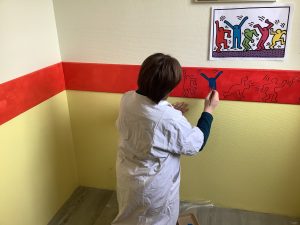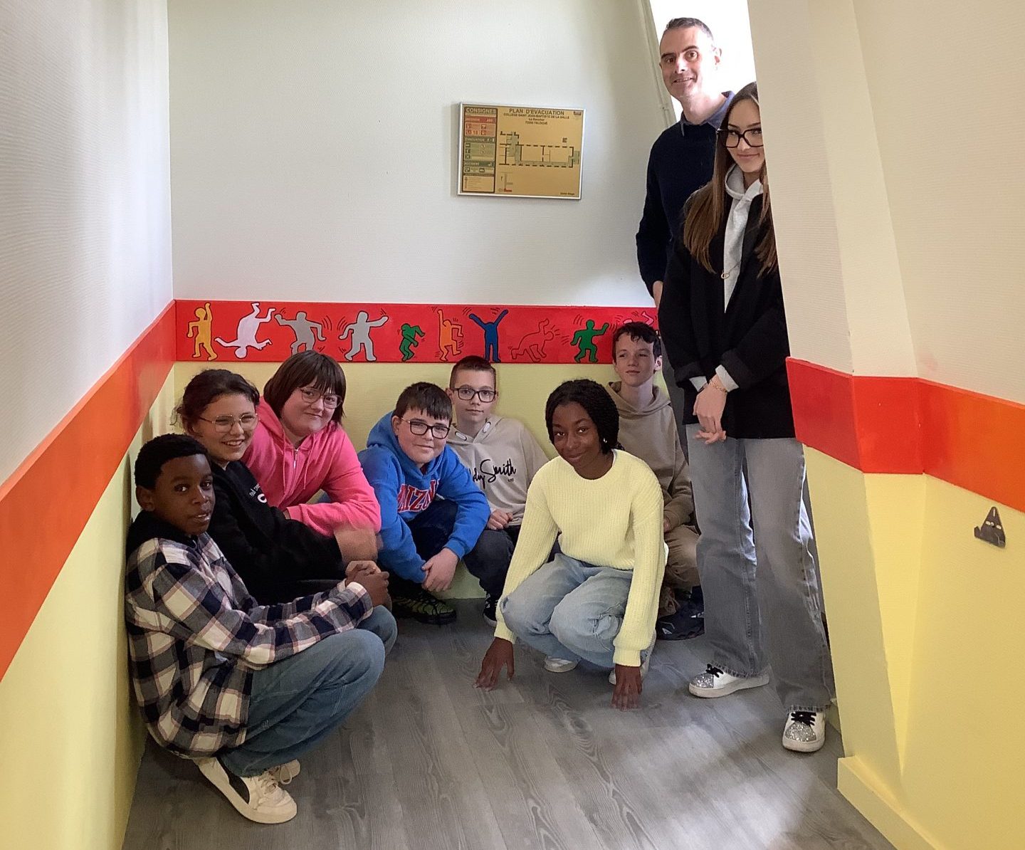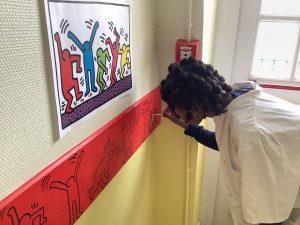 La première partie de la fresque, située au fond du couloir, côté sortie de secours, a d’abord été entièrement pensée comme un grand dégradé allant du jaune au rouge. Des figures liées à Keith Haring ont été ajoutées. La réalisation est désormais achevée. Les élèves posent fièrement devant leur réalisation. (photo)