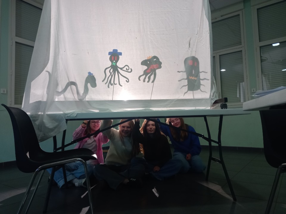 Ce spectacle plein de fantaisie et d’inventivité a nourri les ateliers artistiques proposés l’après midi autour de 3 thématiques : improvisations autour de la place des femmes, théâtre d’objet et monstres en ombres chinoises.