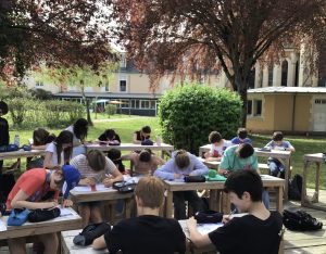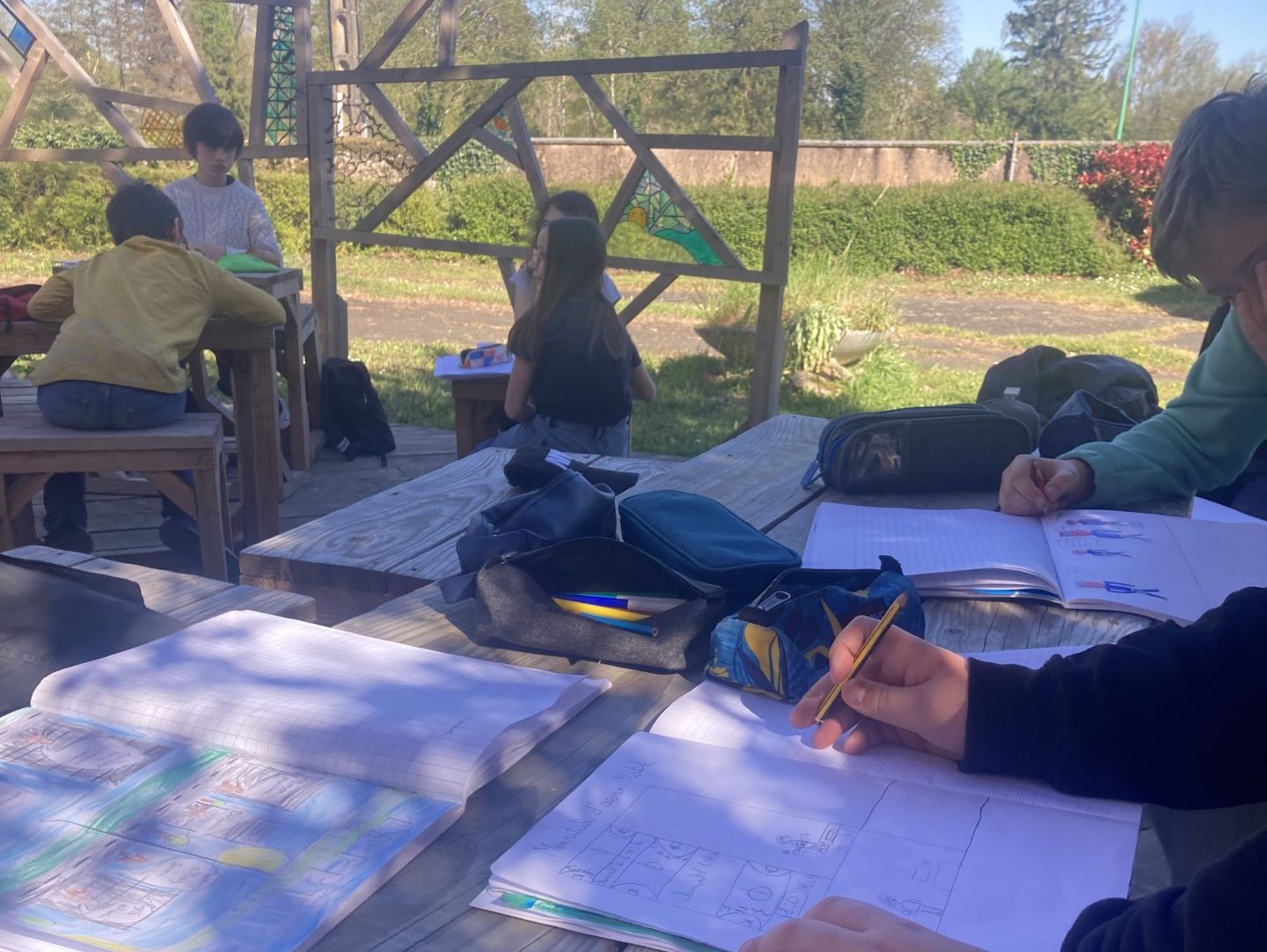 La semaine dernière, les premières classes ont pu en profiter à nouveau. Les élèves de 6e, accompagnés de Madame Couret, ont ainsi investi cet espace pour un cours d’arts plastiques consacré à la création d’une bande dessinée. Une manière originale de laisser libre cours à leur imagination tout en profitant du soleil.